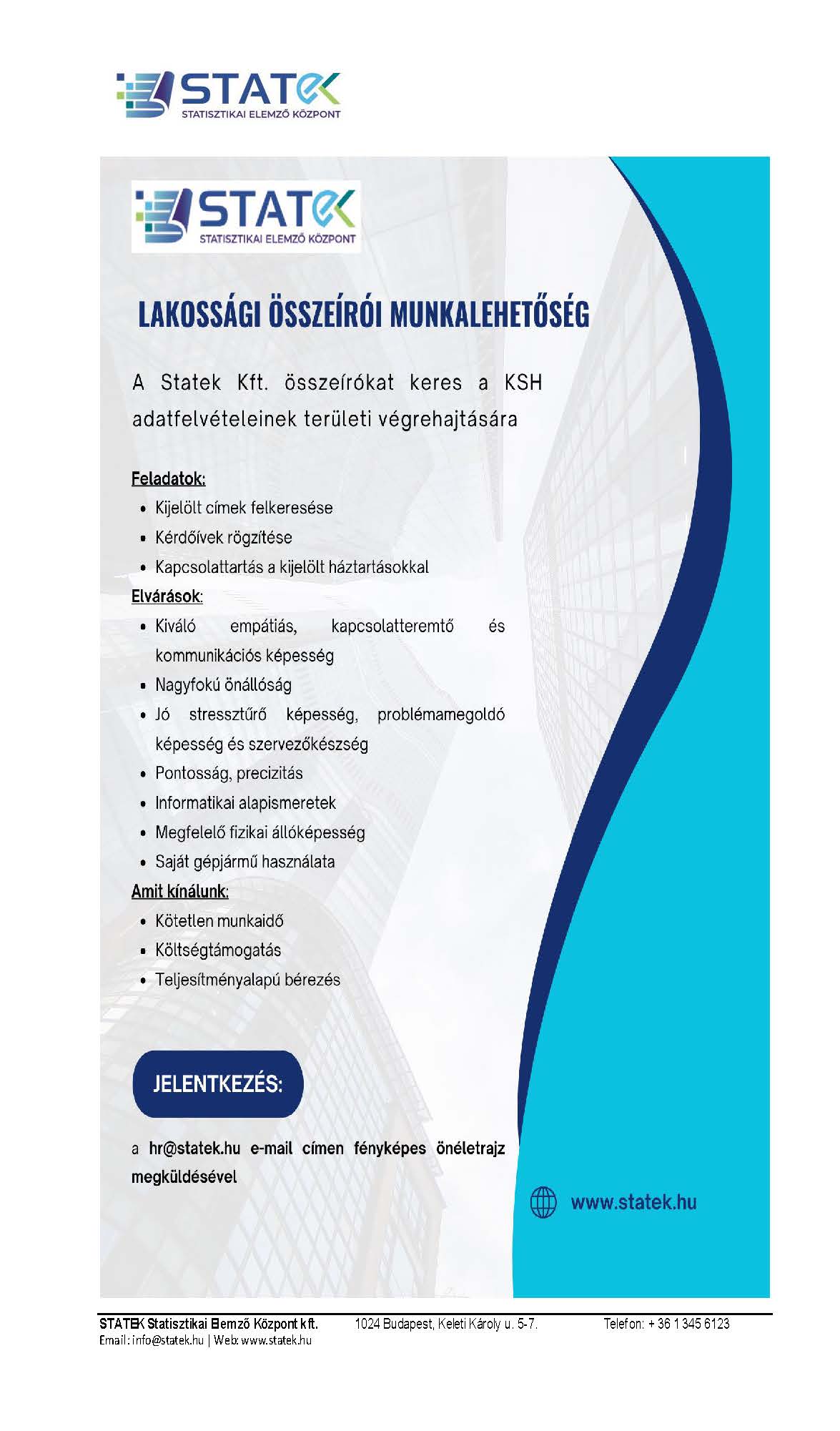 A Statisztikai Elemző Központ Kft. (Statek Kft.) lakossági adatfelvételeket hajt végre a Központi Statisztikai Hivatal megbízásából a mintában szereplő településeken. Egy hamarosan induló felvételben az Önök települése is érintett, melyhez összeírók jelentkezését várjuk.